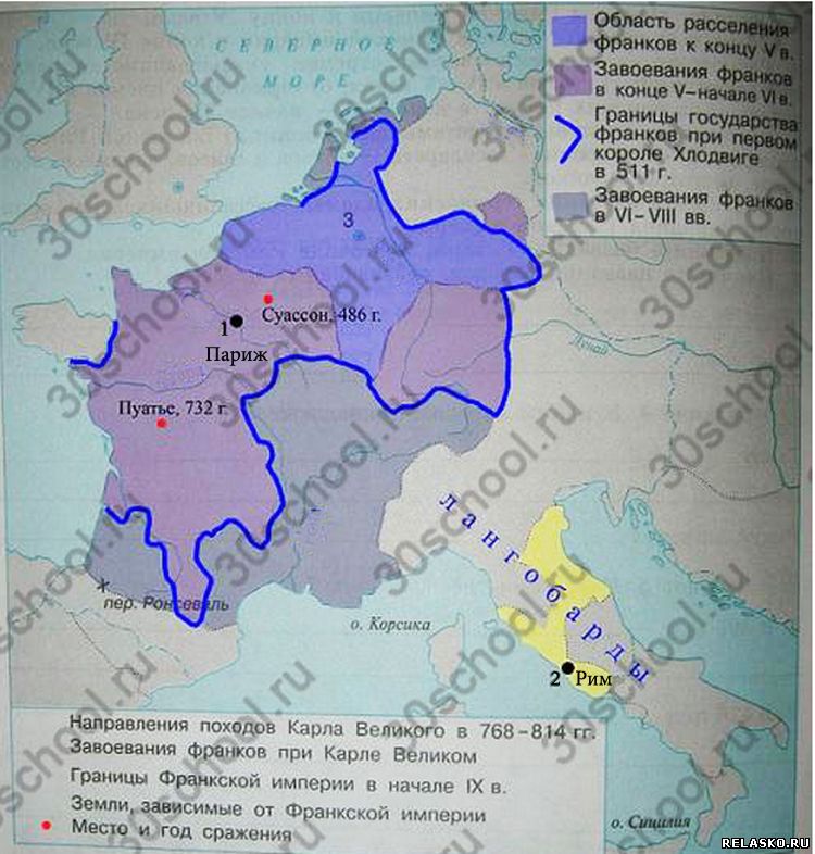 Закрасьте разными цветами: а) область расселения франков к концу V века; б) территории, завоёванные франками в конце V - начале VI века; Обведите границы государства франков при Хлодвиге в 511 году. Раскрасьте разными цветами: а) территории, завоёванные франками в VI-VIII веках; б) Папскую область/ Найдите на карте и подпишите места и годы битв, упомянутых в тексте параграфа. Подпишите название германского народа, обосновавшегося в Италии в VI веке. Подпишите на карте названия городов, обозначенных цифрами 1 и 2.