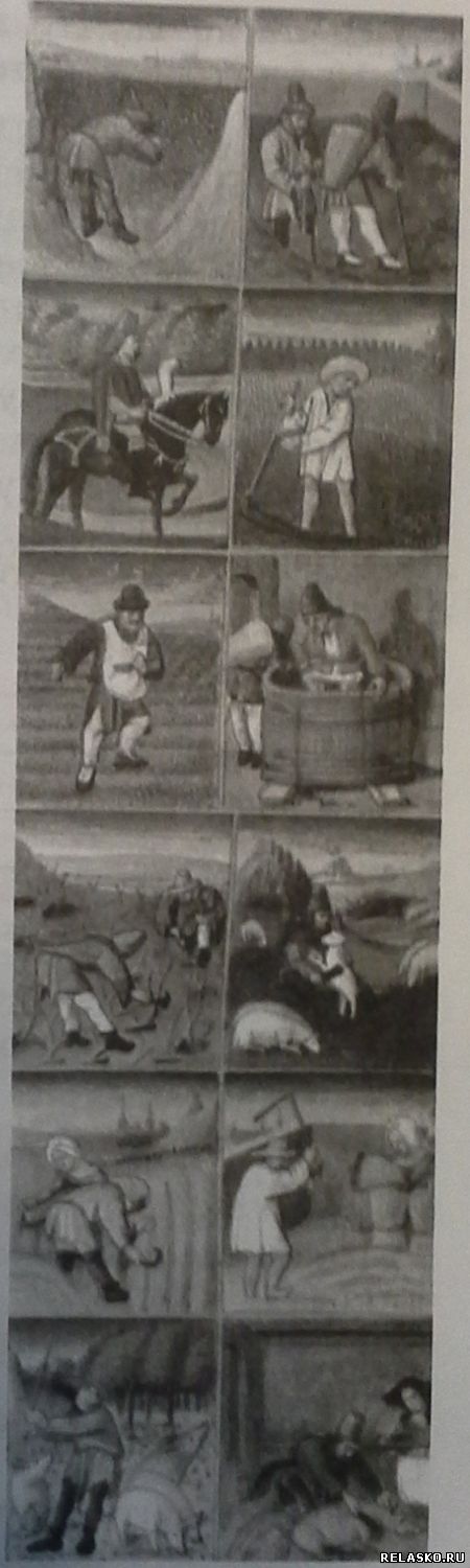 Первый источник - письменный, второй - изобразительный. Из первого источника мы узнаем о праздниках, которых было три. Из миниатюры мы узнаем о видах сельскохозяйственных работ, выполняемых крестьянами в определённое время года. Временные отрезки определялись с помощью церковного календаря (который составлялся с помощью астрономии) и сельскохозяйственных работ.