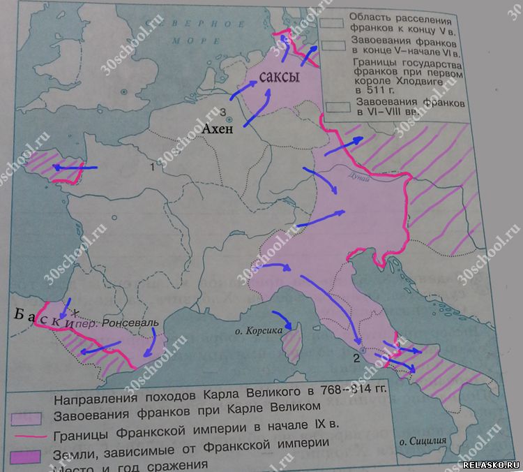 Проведите стрелками направления походов Карла Великого. Раскрасьте территории, завоёванные франками при Карле Великом. Обозначьте границы Франкской империи в начале IX века. Заштрихуйте земли, зависимые от Франкской империи. Подпишите название племени, которое оказало франкам упорное сопротивление. Подпишите название народа, с которым франки встретились в ожесточенной битве в Пиренеях. Напишите название города, обозначенного цифрой 3.