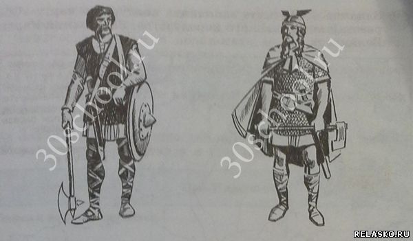 *Обратите внимание, что у одного из изображённых воинов короткие волосы, а у другого - длинные. Это случайно или что-то означает? В документе рассказывается, как, вероломно захватив одного из вождей франков и его сына, Хлодвиг, связав обоих, остриг им волосы. Почему Хлодвиг так поступил? Предположите, кто по обычаям фраков мог иметь длинные волосы.