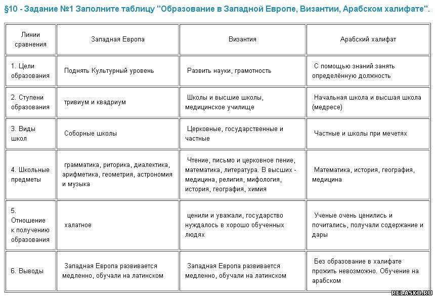 §10 - Задание №1 Заполните таблицу "Образование в Западной Европе, Византии, Арабском халифате".