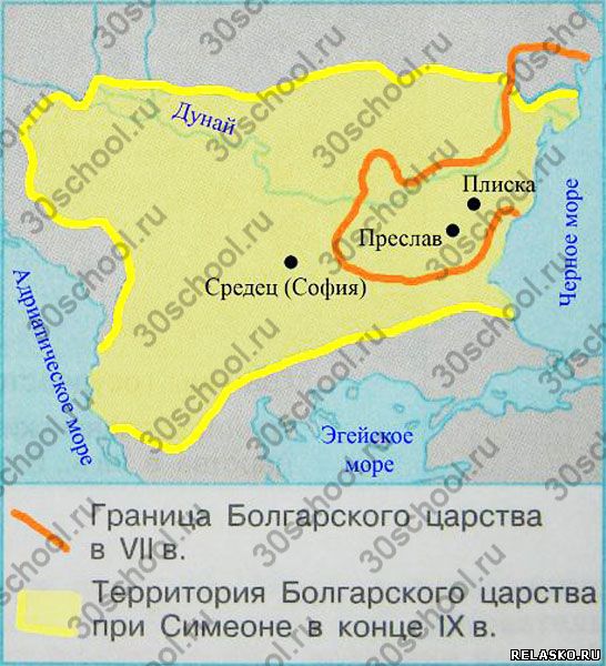 Обведите границу Болгарского царства в VII веке. Обозначьте границу и раскрасьте территорию Болгарского царства в конце IX века. Подпишите на карте названия городов, рек и морей.