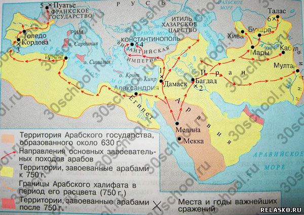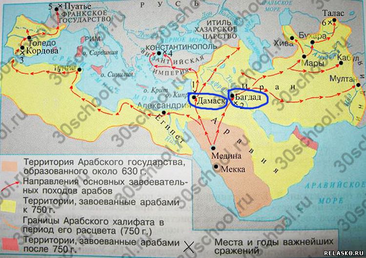 Закрасьте территорию Арабского государства, возникшего около 630 года. Подпишите на карте названия стран: Аравия, Египет, Иран, а также городов: Мекка, Медина, Дамаск, Талас, Багдад, Кордова, Пуатье. Отметьте стрелками направления основных завоевательных походов арабов, укажите места и подпишите даты важнейших сражений. Закрасьте территории: а) завоёванные арабами к 750 году; б) захваченные арабами после 750 года. Обозначьте границы Арабского халифата в 750 году.