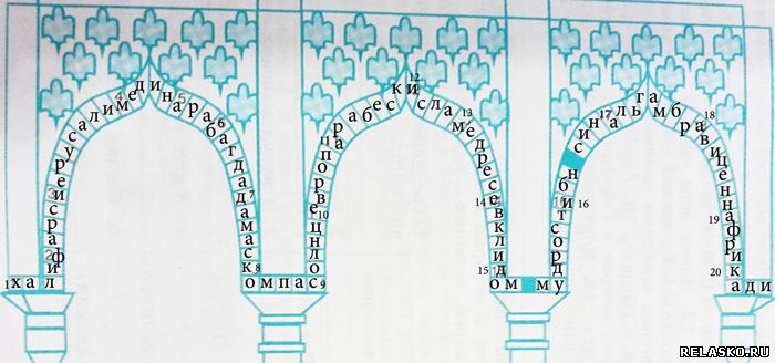1. Правитель Халифата. 2. Таджикско-персидский язык. 3. Город в Палестине, захваченный мусульманами. 4. Город в Аравии. 5. Житель Аравии. 6. Столица Халифата при Аббасидах. 7. Столица Арабского халифата в VII - первой половине VIII века. 8. Прибор, необходимый в мореплавании. 9. Небесное светило, по представлению аль-Бируни, находящееся в центре Вселенной. 10. Часть света, на которую распространились арабские владения в VIII веке. 11. Причудливый узор на стенах арабских построек. 12. Новая вера арабов. 13. Высшие мусульманские школы. 14. Греческий учёный, сочинения которого были знакомы арабским математикам. 15. Хранилище рукописей в Багдаде. 16. Арабское имя "главы учёных". 17. Дворец эмиров в Гранаде. 18. Европейское имя "главы учёных". 19. Континент, север которого в VIII веке был завоёван мусульманами. 20. Духовные судьи у мусульман.