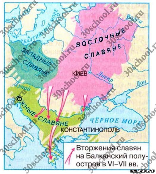 Подпишите названия трёх ветвей славян, закрасьте различными цветами территории их расселения. Напишите на карте названия городов. Обозначьте стрелками вторжения славян на Балканский полуостров.