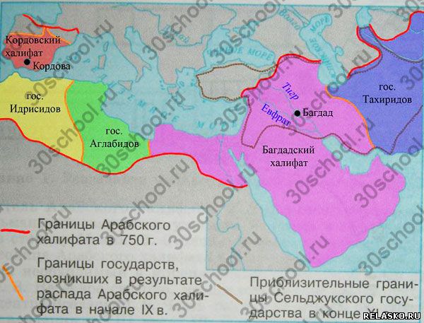 Подпишите на карте названия: Багдадский халифат, Кордовский халифат, Багдад, Кордова, Тигр, Евфрат, Нил. Обозначьте границы государств, возникших в результате распада Арабского халифата в начале IX века. Покажите приблизительные границы государства турок-сельджуков в конце XI века.