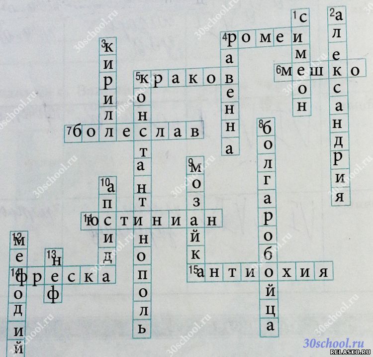 По вертикали. 1. Правитель Болгарии, вступивший в военное противоборство с Византией. 2. Город Византийской империи, основанный в Египте после походов Александра Македонского. 3, 12. Создатели славянской письменности. 4. Столица остготов, захваченная византийцами. 5. Столица Византии. 8. Прозвище византийского императора, жестоко расправившегося с пленными болгарскими воинами. 9. Изображения из разноцветных камешков или смальты. 10. Выступающая наружу часть христианского храма, изнутри напоминающая полукруглую нишу. 13. Часть христианского храма, название которой в переводе с французского означает "корабль".