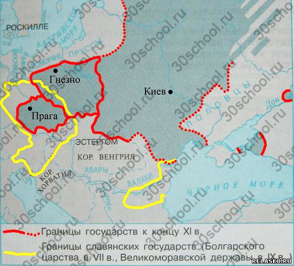 Обозначьте границы Болгарского царства в VII веке, Великоморавской державы в IX веке. Обозначьте границы Чехии, Польши и Древнерусского государства к концу XI века и подпишите на карте их столицы.