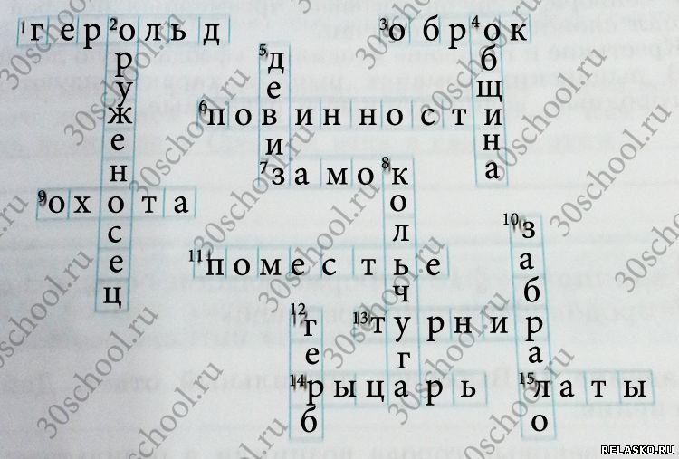 Ответ по горизонтали: 1. Герольд, 3. Оброк, 6. Барщина 7. Замок 9. Охота 11. Поместье 13. Турнир 14. Рыцарь 15 . Латы
