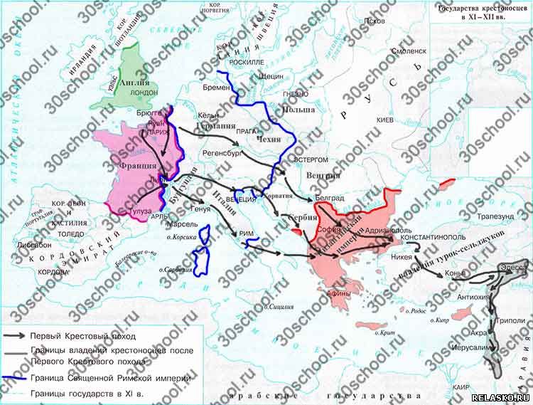 Обозначьте стрелками путь участников Первого Крестового похода. Обведите границы владений крестоносцев после Первого Крестового похода. Обозначьте границы Священной Римской империи, Англии, Франции, Византийской империи. Подпишите названия: Англия, Германия, Франция, Италия, Бургундия, Польша, Чехия, Венгрия, Сербия, Хорватия, Византийская империя, владения турок-сельджуков, арабские государства.