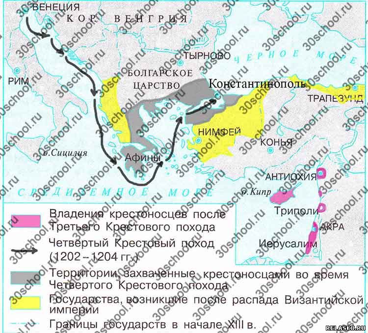 Закрасьте различными цветами: а) владения крестоносцев после Третьего Крестового похода; б) территории, захваченные крестоносцами во время Четвёртого Крестового похода; в) государства, возникшие после распада Византийской империи. Отметьте стрелками путь участников Четвёртого Крестового похода. Подпишите название города, захваченного крестоносцами в 1204 году.