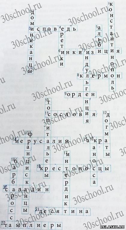 Ответ по горизонтали: 3. Исповедь. 6. Инквизиция 8. Клермон 9. Орден 11. Сословия 14. Иерусалим 15. Акра. 19. Крестоносцы 20. Саладин 21. Десятина 22. Тамплиеры.