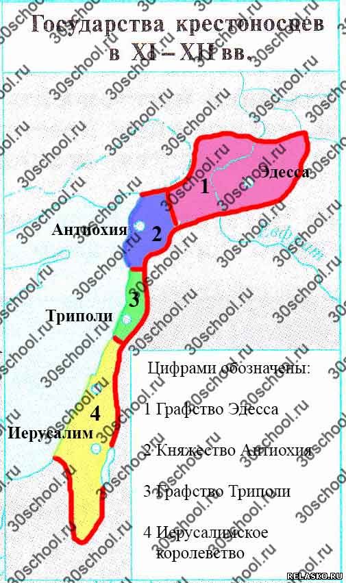 Отметьте границы и раскрасьте различными цветами государства крестоносцев. Обозначьте на карте цифрами и подпишите их названия Ответ: Эдесса Ответ: Антиохия Ответ: Триполь Ответ: Иерусалим Подпишите на карте названия городов государств крестоносцев.