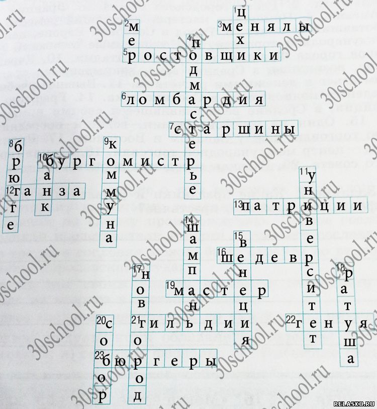 По горизонтали. 3. Люди, занимавшиеся обменом денег за плату. 5. Люди, дававшие деньги взаймы и получавшие прибыль в виде процентов. 6. Область Северной Италии. 7. Члены цеха, следившие за соблюдением его устава. 10. Глава городского совета в Германии. 12. Объединение купцов немецких городов. 13. Знатные горожане. 16. Образцовое изделие. 19. Владелец и основной работник мастерской. 21. Объединения купцов. 22. Один из городов Италии, ведший посредническую торговлю между Западом и Востоком. 23. Название горожан в Средние века.