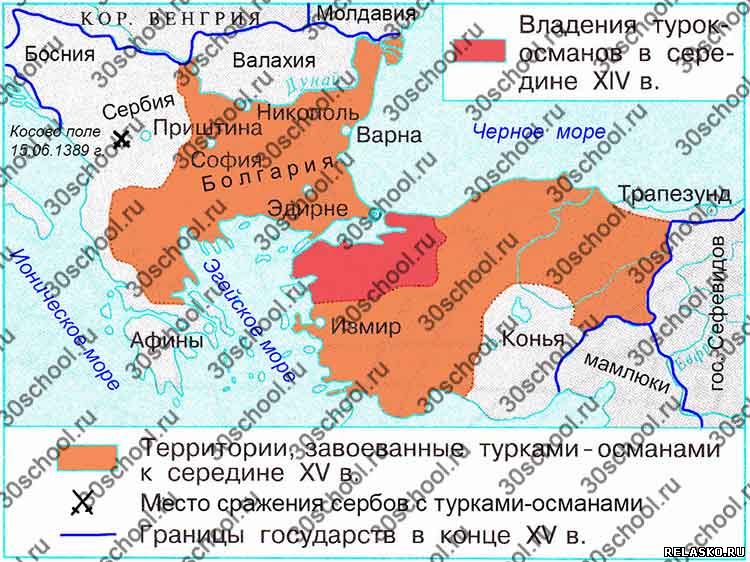 Закрасьте различными цветами: а) владения турок-османов в середине XIV века; б) территории, завоёванные турками-османами к середине XV века. Подпишите моря: Ионическое, Эгейское, Чёрное. Подпишите названия: Сербия, Болгария, Босния, Албания, Валахия, Константинополь. Подпишите годы и обозначьте места основных сражений. Обведите границы государств в конце XV века.