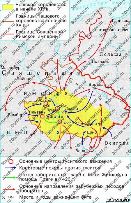 Обозначьте: а) границы Чешского королевства в начале XV века; б) границу Священной Римской империи. Подпишите названия: Чехия, Моравия, Силезия, Польша, Тевтонский орден, Венгрия, Священная Римская империя, Прага, Табор, Липаны. Обведите цветными кружками основные центры гуситского движения. Покажите стрелками: а) Крестовые походы против гуситов; б) походы таборитов во главе с Яном Жижкой на помощь Праге в 1420 году; в) основные направления зарубежных походов таборитов; Обозначьте места важнейших битв и подпишите их даты.