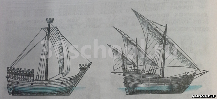 Рассмотрите рисунки, на которых изображены два корабля, и определите, где ганзейское судно, а где каравелла. Какие мореходные качества имел каждый из кораблей?