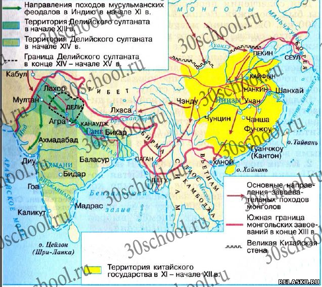 Подпишите реки Хуанхэ, Янцзы. Закрасьте территорию империи Сун в XI - начале XII века. Отметьте основные направления завоевательных походов монголов. Обозначьте южную границу монгольских завоеваний в конце XIII века. Покажите Великую Китайскую стену. Подпишите столицу Китая во времена монгольского завоевания. Подпишите реку Ганг, Аравийское море и Бенгальский залив. Обозначьте направления походов мусульманских феодалов в Индию в начале XI века. Закрасьте территорию Делийского султаната в начале XIV века. Обведите границу Делийского султана в начале XV века. Подпишите его столицу.