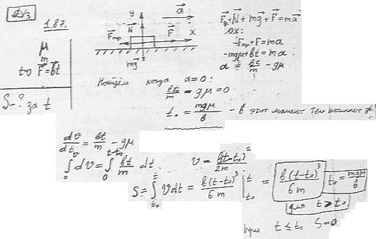 Задача № 1.103 Условие задачи: На горизонтальной плоскости с коэффициентом трения k лежит тело массы m. В момент t = 0 к нему приложили горизонтальную силу, меняющуюся со временем по закону F = at, где а — постоянный вектор. Найти путь, пройденный телом за первые t секунд после начала действия этой силы. Решение задачи и правильный ответ: