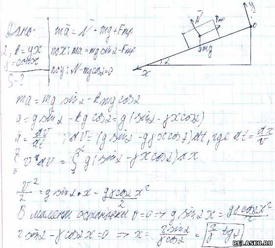 Задача № 1.102 Условие задачи: Небольшой брусок начинает скользить по наклонной плоскости, составляющей угол α с горизонтом. Коэффициент трения зависит от пройденного пути х по закону k = ах, где а — постоянная. Найти путь, пройденный бруском до остановки, и максимальную скорость его на этом пути. Решение задачи и правильный ответ:
