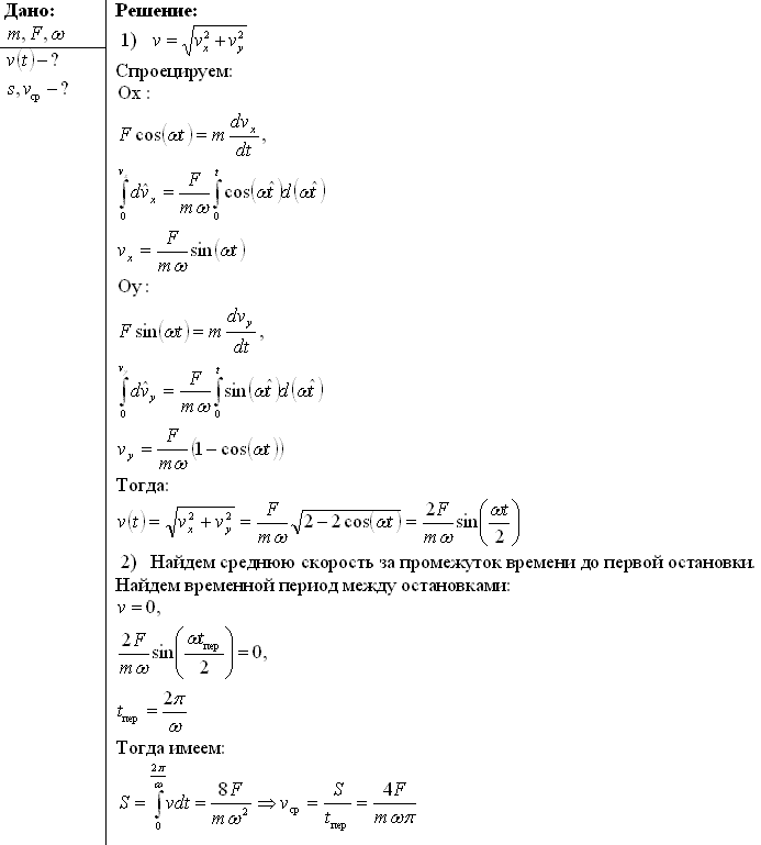 Задача № 1.105 Условие задачи: Частица массы m движется в некоторой плоскости P под действием постоянной по модулю силы F, вектор которой поворачивается в этой плоскости с постоянной угловой скоростью ω. Считая, что в момент t = 0 частица покоилась, найти: а) ее скорость в зависимости от времени; б) путь, проходимый частицей между двумя последовательными остановками, и среднюю скорость за это время. Решение задачи и правильный ответ:
