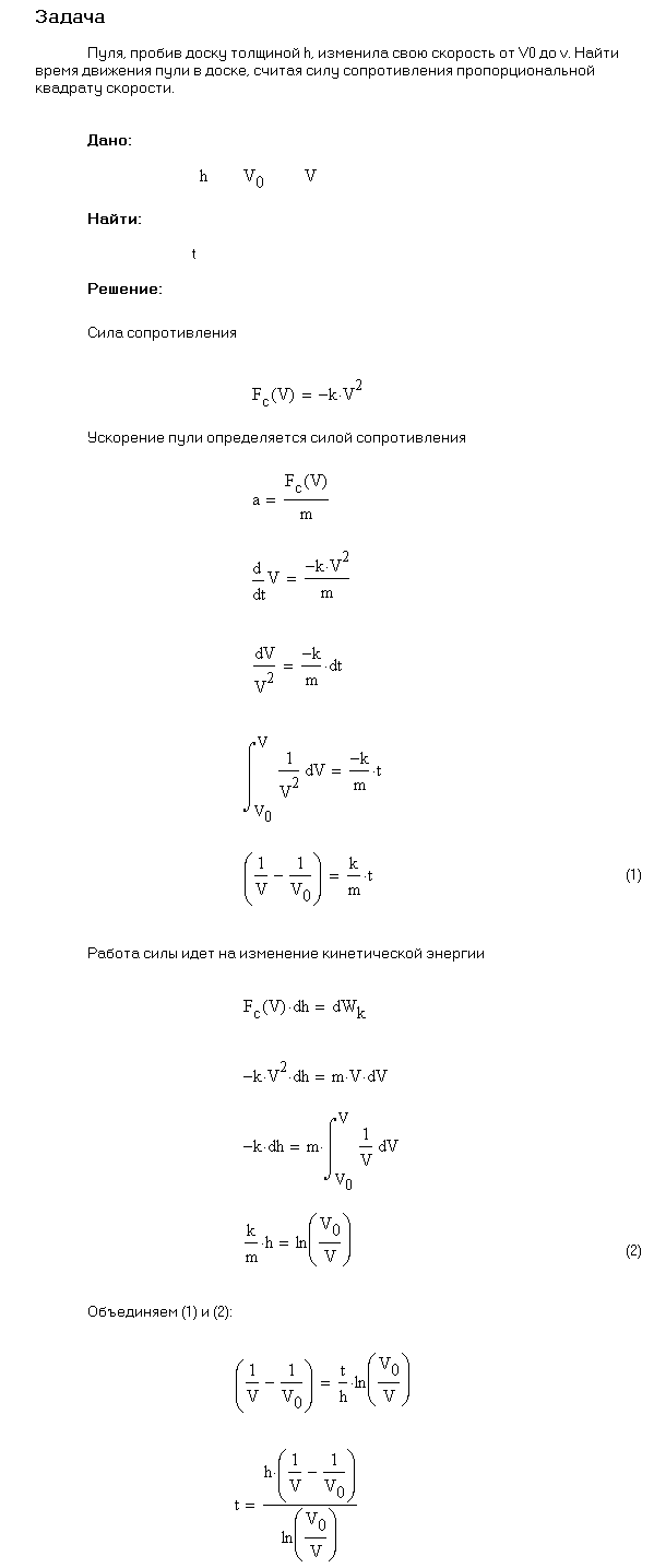 Задача № 1.101 Условие задачи: Пуля, пробив доску толщиной h, изменила свою скорость от v0 до v. Найти время движения пули в доске, считая силу сопротивления пропорциональной квадрату скорости. Решение задачи и правильный ответ: