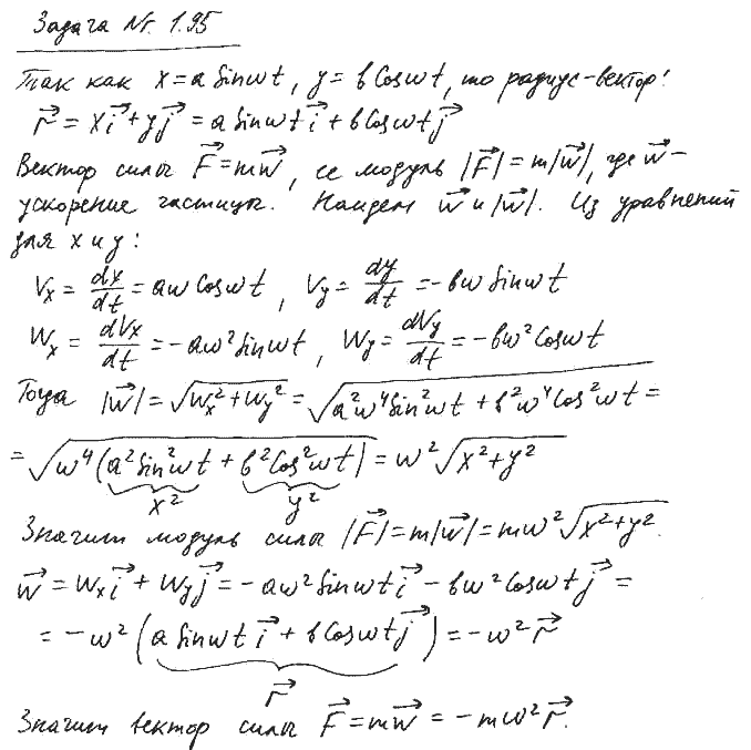 Задача № 1.95 Условие задачи: Найти модуль и направление вектора силы, действующей на частицу массы m при ее движении в плоскости ху по закону х = a sin ωt, у = b cos ωt, где a, b, ω — постоянные. Решение задачи и правильный ответ: