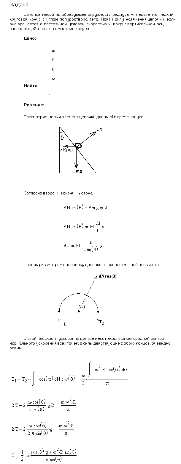 Задача № 1.92 Условие задачи: Цепочка массы m, образующая окружность радиуса R, надета на гладкий круговой конус с углом полураствора ϑ. Найти натяжение цепочки, если она вращается с постоянной угловой скоростью ω вокруг вертикальной оси, совпадающей с осью симметрии конуса. Решение задачи и правильный ответ: