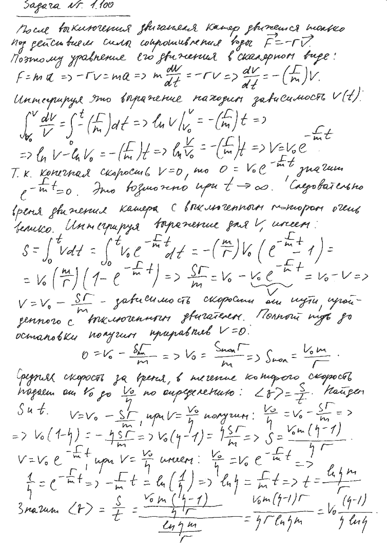 Задача № 1.100 Условие задачи: Катер массы m движется по озеру со скоростью v0. В момент t = 0 выключили его двигатель. Считая силу сопротивления воды движению катера пропорциональной его скорости F = —rv, найти: а) время движения катера с выключенным двигателем; б) скорость катера в зависимости от пути, пройденного с выключенным двигателем, а также полный путь до остановки; в) среднюю скорость катера за время, в течение которого его начальная скорость уменьшится в η раз. Решение задачи и правильный ответ: