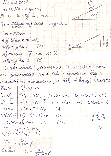 Задача № 1.106 Условие задачи: Небольшую шайбу А положили на наклонную плоскость, составляющую угол α с горизонтом, и сообщили начальную скорость v0 (рис. 1.27). Найти зависимость скорости шайбы от угла φ, если коэффициент трения k = tg α и в начальный момент φ0 = π/2. Решение задачи и правильный ответ: