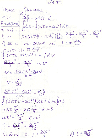 Задача № 1.97 Условие задачи: На покоившуюся частицу массы m в момент t = 0 начала действовать сила, меняющаяся со временем по закону F = at (τ — t), где а — постоянный вектор, τ — время, в течение которого действует данная сила. Найти: а) импульс частицы после окончания действия силы; б) путь, пройденный частицей за время действия силы. Решение задачи и правильный ответ: