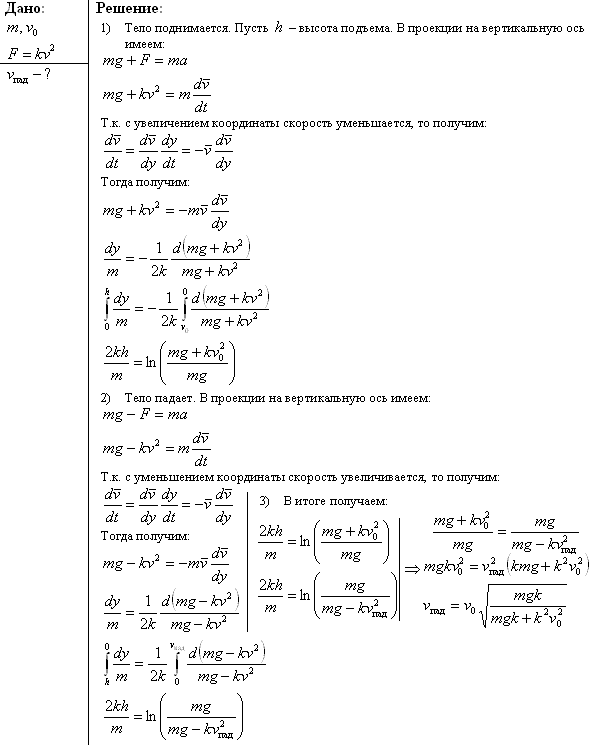 Задача № 1.104 Условие задачи: Тело массы m бросили вертикально вверх со скоростью v0. Найти скорость v', с которой тело упадет обратно, если сила сопротивления воздуха равна kv2, где k — постоянная, v — скорость тела. Решение задачи и правильный ответ:
