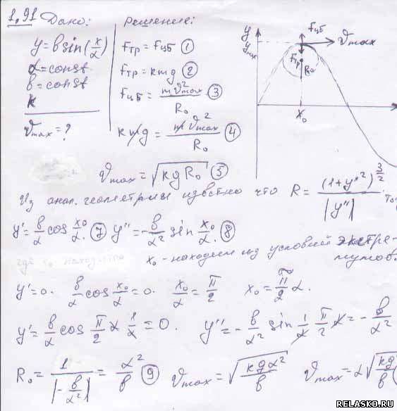 Выберите задание из учебника: 51-60 61-70 71-80 81-90 91-100 101-110 111-120 Задача № 1.91 Условие задачи: Автомашина движется равномерно по горизонтальному пути, имеющему форму синусоиды y = a sin (x/α), где a и α — некоторые постоянные. Коэффициент трения между колесами и дорогой равен k. При какой скорости движение автомашины будет происходить без скольжения? Решение задачи и правильный ответ: