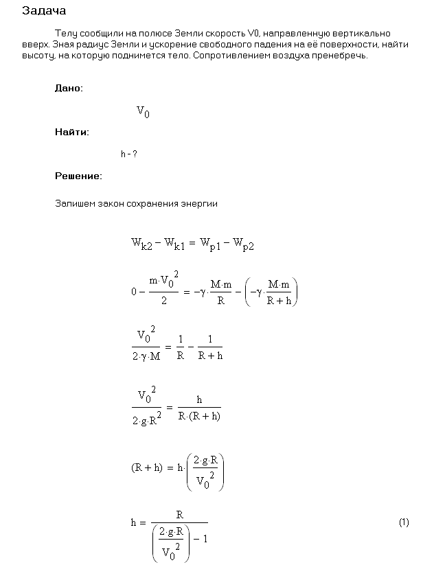 Задача № 1.221 Условие задачи: Телу сообщили на полюсе Земли скорость v0, направленную вертикально вверх. Зная радиус Земли и ускорение свободного падения на ее поверхности, найти высоту, на которую поднимется тело. Сопротивлением воздуха пренебречь. Решение задачи и правильный ответ: