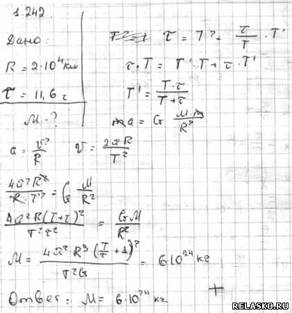 Задача № 1.224 Условие задачи: Спутник, движущийся по круговой орбите радиуса R = 2,00*104 км в экваториальной плоскости Земли с Запада на Восток, появляется над некоторым пунктом на экваторе через каждые τ = 11,6 ч. Вычислить на основании этих данных массу Земли. Гравитационная постоянная предполагается известной. Решение задачи и правильный ответ:
