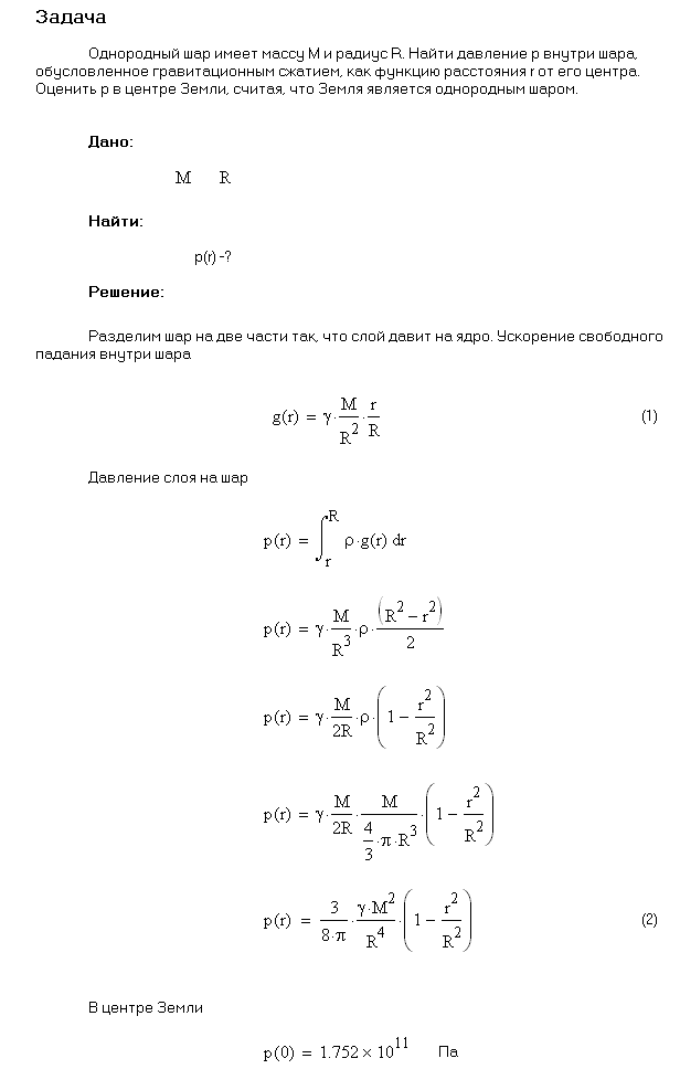 Задача № 1.216 Условие задачи: Однородный шар имеет массу M и радиус R. Найти давление p внутри шара, обусловленное гравитационным сжатием, как функцию расстояния r от его центра. Оценить p в центре Земли, считая, что Земля является однородным шаром. Решение задачи и правильный ответ: