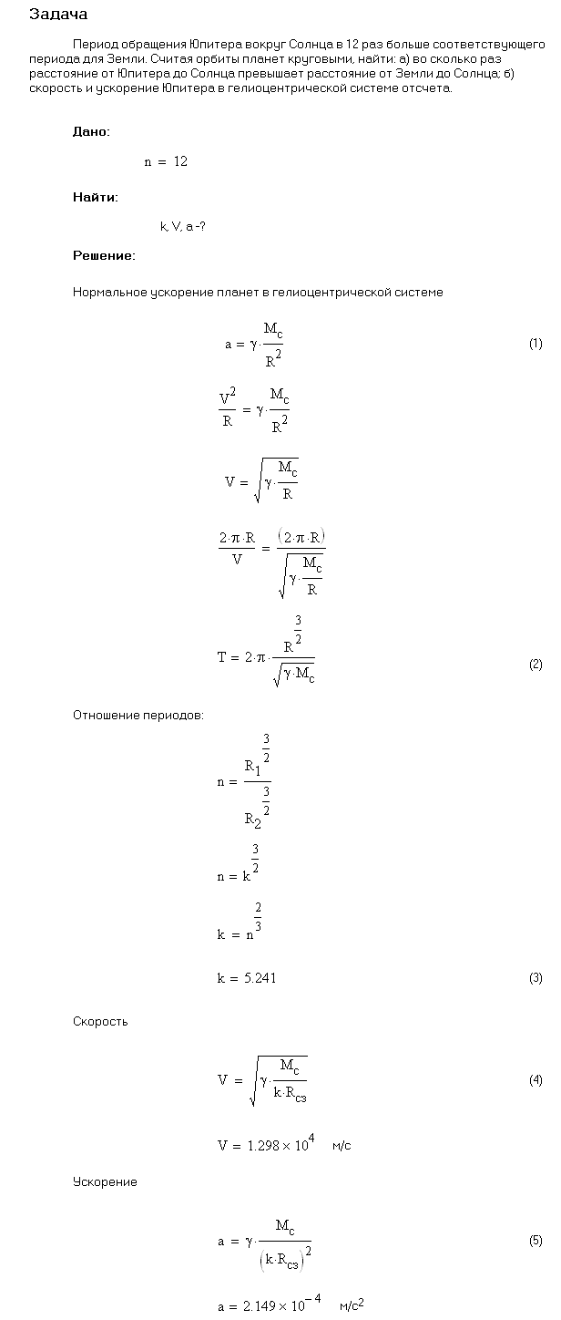 Задача № 1.201 Условие задачи: Период обращения Юпитера вокруг Солнца в 12 раз больше соответствующего периода для Земли. Считая орбиты планет круговыми, найти: а) во сколько раз расстояние от Юпитера до Солнца превышает расстояние от Земли до Солнца; б) скорость и ускорение Юпитера в гелиоцентрической системе отсчета. Решение задачи и правильный ответ: