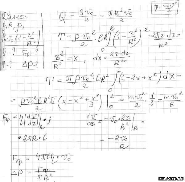 По трубке длины l и радиуса R течет стационарный поток жидкости, плотность которой ρ и вязкость η. Скорость течения жидкости зависит от расстояния r до оси трубки по закону v = v0 (1 — r2/R2). Найти: