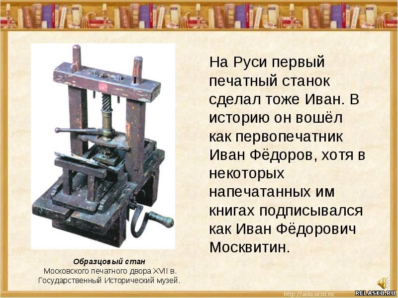 Появление типографского станка – важная веха в истории культуры. До изобретения книгопечатания, по словам академика В.И.Вернадского, «человеческая личность не имела никакой возможности предохранять, хотя бы несколько, свою мысль от исчезновения, распространить ее широко, переждать неблагоприятное время и сохранить ее до лучших времен. Вечно и постоянно все создавалось и вновь разрушалось тлетворным влиянием все разрушающего времени».