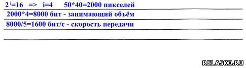 148. Размер рабочей области графического редактора, работающего с 16-цветной палитрой, равен 50 х 40 пикселей. Картинка, занимающая всю рабочую область графического редактора, передаётся по некоторому каналу связи за 5 с. Определите скорость передачи информации по этому каналу.