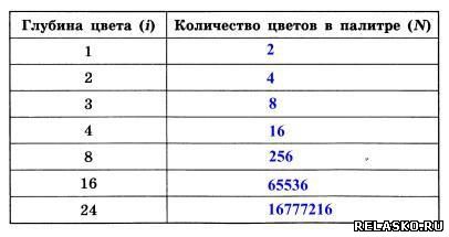 127. Заполните таблицу, вычислив количество цветов в палитре N при известной глубине цвета i: