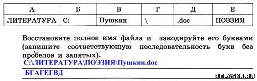 106. Файл Пушкин.doc хранится на жёстком диске в каталоге ПОЭЗИЯ, который является подкаталогом каталога ЛИТЕРАТУРА. В таблице приведены фрагменты полного имени файла: