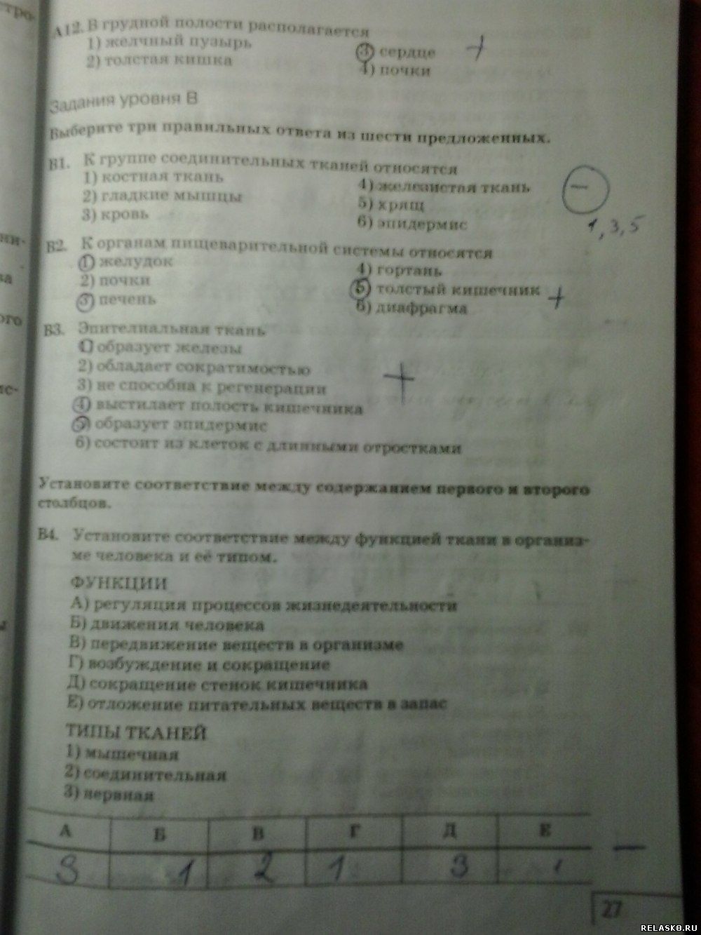 Решебник и ГДЗ по Биологии. 8 класс. Cонин Н. И., Сапин М. Р. Рабочая тетрадь. "Биология. Человек" Авторы: Cонин Н.И., Сапин М.Р. Агафонова И. Б. Издание: Издатель Дрофа Учебник с заданиями, примерами и ответами по ФГОС 2007, 2008, 2009, 2010, 2011, 2012, 2013, 2014 год Данный решебник и готовые домашние задания по Биологиипредназначены для учителей и учеников 8 класса средней школы для проверки своих знаний предмета, а также для помощи в решении домашних заданий. Преподаватели урока Биологии с помощью данного учебника смогут легко и быстро проверять ответы на домашние работы у своих учеников, а так же подготовиться к уроку. Родители учеников могут так же проверять своих детей, на сколько правильно они сделали домашнюю работу. Оглавление решебника и ГДЗ по Биологии. 8 класс. Cонин Н. И., Сапин М. Р. Рабочая тетрадь. "Биология. Человек" Место человека в системе органического мира Эволюция человека 7 Расы человека 9 История развития знаний о строении и функциях организма человека 10 Тренировочные задания 12 Клеточное строение организма 16 Ткани и органы 18 Системы органов 22 Тренировочные задания 25 Координация и регуляция 29 Гуморальная регуляция 29 Строение и значение нервной системы 32 Строение и функции спинного мозга 35 Строение и функции головного мозга 37 Полушария большого мозга 39 Тренировочные задания 41 Анализаторы 45 Зрительный анализатор. Строение и функции глаза 45 Анализаторы слуха и равновесия 50 Кожно-мышечная чувствительность. Обоняние. Вкус 53 Тренировочные задания 56 Опора и движение 61 Кости скелета 61 Строение скелета 65 Мышцы. Общий обзор 68 Работа мышц 69 Тренировочные задания 70 Внутренняя среда организма 74 Кровь 74 Как наш организм защищается от инфекции 77 Тренировочные задания 79 Транспорт веществ 82 Органы кровообращения 82 Работа сердца 84 Движение крови по сосудам 85 Тренировочные задания 87 Дыхание 91 Строение органов дыхания 91 Газообмен в лёгких и тканях 94 Тренировочные задания 96 Пищеварение 99 Пищевые продукты, питательные вещества и их превращения в организме 99 Пищеварение в ротовой полости 100 Пищеварение в желудке и кишечнике 104 Тренировочные задания 107 Обмен веществ и энергии 110 Пластический и энергетический обмен 110 Витамины 112 Тренировочные задания 113 Выделение 116 Тренировочные задания 118 Покровы тела 120 Строение и функции кожи 120 Роль кожи в терморегуляции организма 121 Тренировочные задания 122 Размножение. Развитие человека. Возрастные процессы 124 Тренировочные задания 127 Высшая нервная деятельность 31 Рефлекторная деятельность нервной системы 131 Бодрствование и сон 134 Сознание и мышление. Речь 135 Познавательные процессы и интеллект 136 Память 137 Эмоции и темперамент 137 Тренировочные задания 139 Человек и его здоровье 142 Здоровье и влияющие на него факторы 142 Оказание первой доврачебной помощи 142 Вредные привычки 145 Заболевания человека 146 Двигательная активность и здоровье человека 148 Закаливание 148 Гигиена человека 149 Тренировочные задания 153