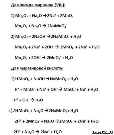 7. Формула высшего оксида марганца а формула его гидроксида – Оба соединения имеют кислотный характер (для подтверждения приведите по два уравнения возможных реакций в молекулярной и ионной формах):