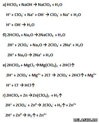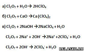 7. Оксид хлора (VII) проявляет все типичные свойства кислотных оксидов (подтвердите уравнениями соответствующих реакций в молекулярной, полной и сокращённой ионной формах, где это имеет место):