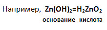2. Амфотерные гидроксиды – это гидроксиды, например, элементов с порядковыми номерами 4, 13, 30 – Be, Al, Zn. Каждый гидроксид проявляет , в зависимости от условий реакций, свойства то основания, то кислоты.