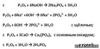 9) Высший оксид фосфора имеет формулу Р2О5 и название оксид фосфора V. Это кислотный оксид. Он взаимодействует (запишите уравнения возможных реакций, в том числе в полной и сокращённой ионной форме для реакций с участием электролитов):