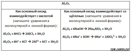9) Оксид алюминия имеет амфотерный характер, поэтому взаимодействует и с кислотой, и с щёлочью, образуя соль и воду.