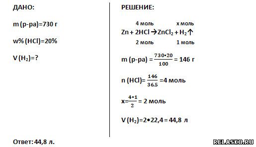 8. Рассчитайте объём водорода, образующегося при взаимодействии 730 г 20%-го раствора соляной кислоты с необходимым количеством цинка. Каково это количество?