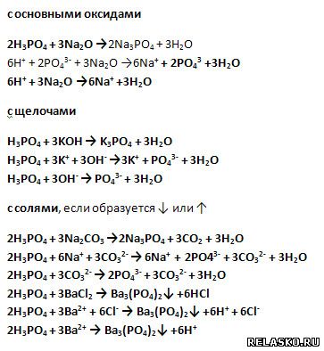 Это двухосновная, кислородсодержащая, растворимая в воде, нелетучая, стабильная, но слабая кислота. Поэтому в ионных уравнениях реакций с участием фосфорной кислоты её формулу следует записывать в молекулярной форме. Реакция с металлами для фосфорной кислоты нехарактерна. Остальные свойства – типичные для кислот. Она взаимодействует (составьте уравнения возможных реакций – молекулярные, полные и сокращённые ионные):